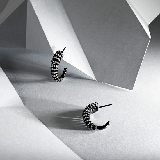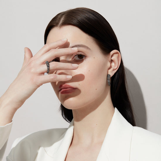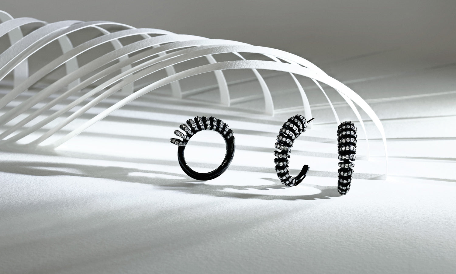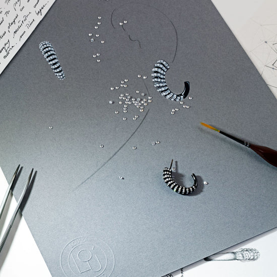 The infinite design pays homage to the power of negative space, which is accentuated through the pairing of 18k blackened gold with bright white diamonds. A striking colour combination that heightens the perpetual motion felt within the design of the bangle, earrings, and ring.